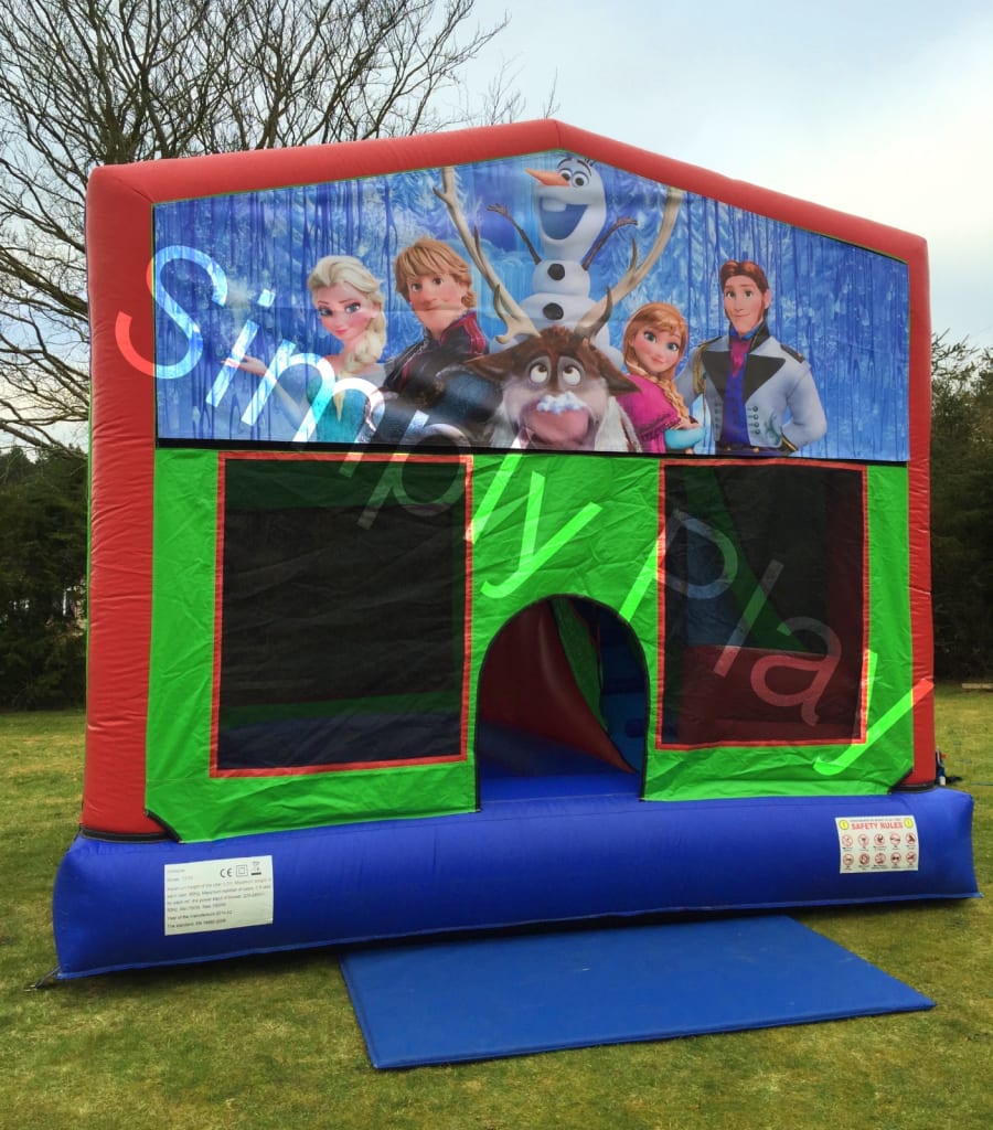 This is a Frozen themed bouncy castle. The artwork features characters from the Frozen movie on both sides of an entrance to the castle. This very unique castle incorporates a very spacious bouncing area with a slide to the side. This bouncing castle is suitable for children of all ages and it's very popular with girls. It is covered. If you want to make your party a day to remember, our Frozen combi is a