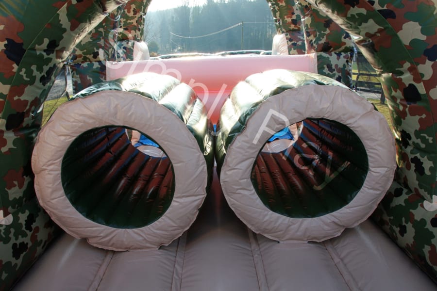 This Army Themed obstacle course is a two lane climbing obstacle whereby you enter the unit at the back through a series of inflatable pillars over the climbing wall, through the tunnels and then faced with a high climbing wall up to the top and then slide down the steep slide, this is hugely popular with older children. It’s camouflage design looks so impressive