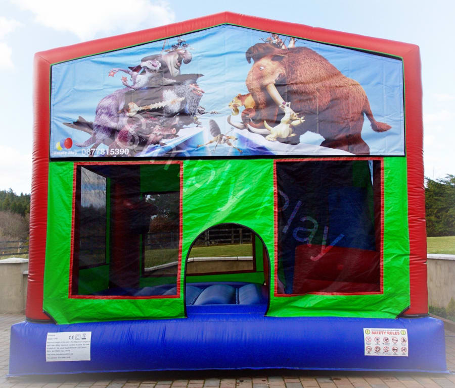 This is a Ice Age themed bouncy castle. The artwork features a Ice Age on both sides of an entrance to the castle. This very unique castle incorporates a very spacious bouncing area with a slide to the side. This bouncing castle is suitable for children of all ages and it's very popular with girls. It is partially covered. If you want to make your party a day to remember, our Ice Age combi is a great