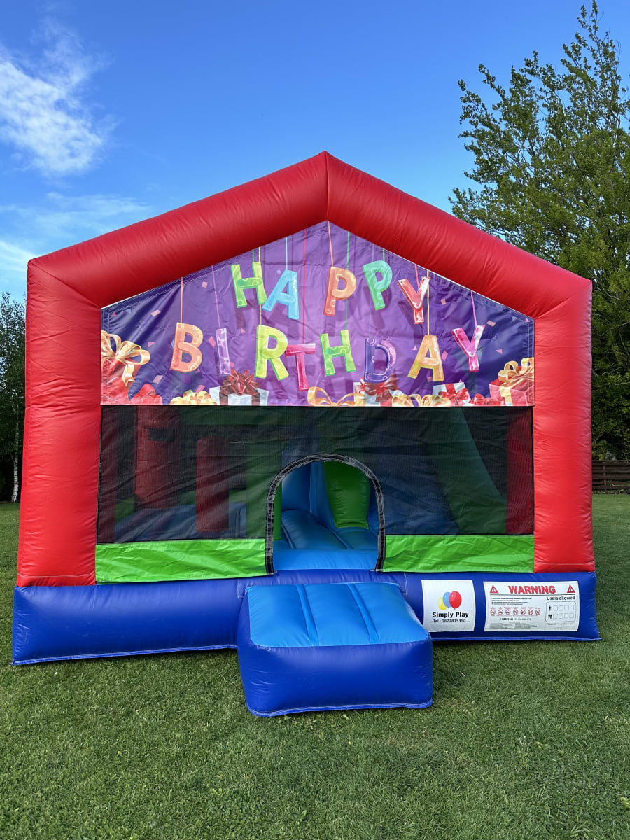 This fantastic covered 16 x13 bouncy castle with slide is great fun for all ages ,climb the stairway to the top of the slide and slide down ,why not have a game of basketball bounce away and take a shot a few bish bash inside will make it even more fun if you miss back and do it all over again ,there is loads of space in this cool bouncing castle also ur castles have a net front which is a great idea because the smaller kids cant fall out.but you can peep inside to make sure they are having fun