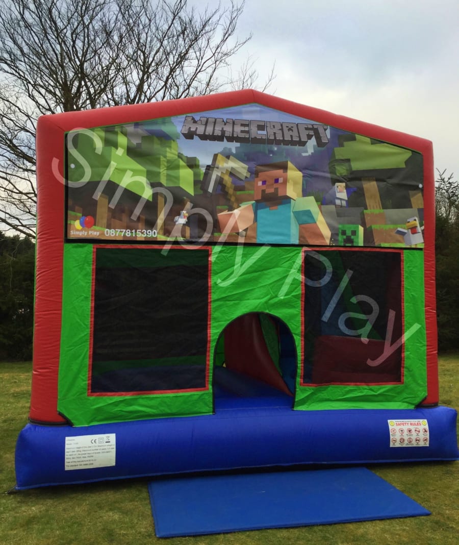 This is a Minecraft themed bouncy castle. The artwork features characters from the Minecraft Game on both sides of an entrance to the castle. This very unique castle incorporates a very spacious bouncing area with a slide to the side. This bouncing castle is suitable for children of all ages . It is covered. If you want to make your party a day to remember, our Minecraft combi is a great