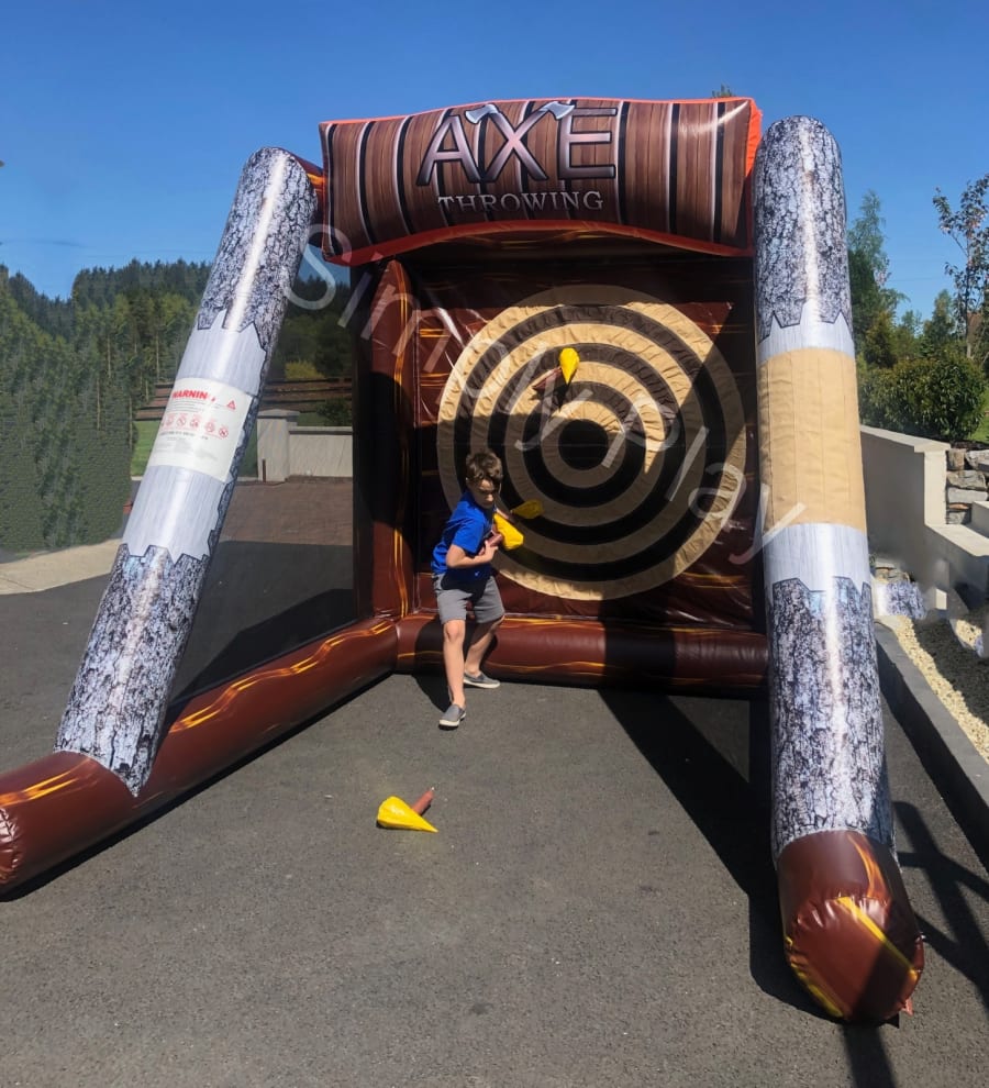 Test your skills in this famous western themed inflatable Axe Throw Game, which is a safe and fun inflatable game for players of all ages. Challenge a friend in a head to head battle and see who has the best axe throwing skills. Comes with 6 fake inflatable axe throw game accessories which are made with foam and velcro material, not actual axes