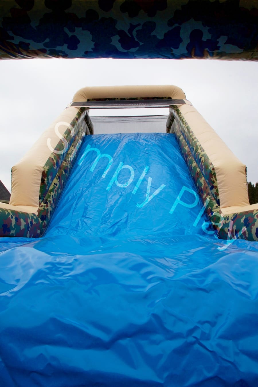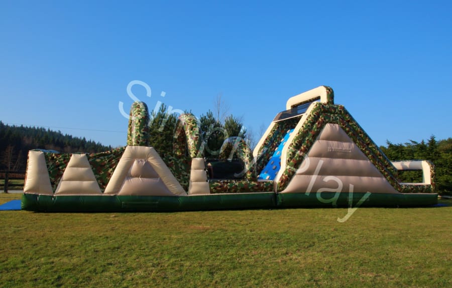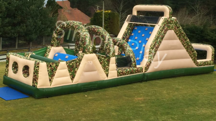 This Army Themed obstacle course is a two lane climbing obstacle whereby you enter the unit at the back through a series of inflatable pillars over the climbing wall, through the tunnels and then faced with a high climbing wall up to the top and then slide down the steep slide, this is hugely popular with older children. It’s camouflage design looks so impressive