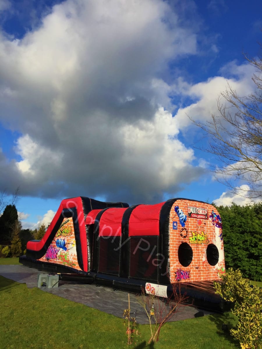 Test your military precision with this astounding 46ft bootcamp challenge which incorporates hurdles, tires, hedgehog pop-ups, tunnels, climbing wall and slide complete with graffiti artwork is perfect for children and teenagers.